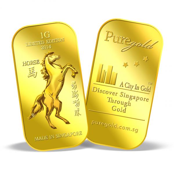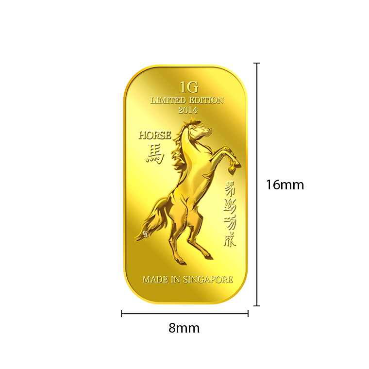 The 1g Horse Gold Bar design portrays an image of a horse rearing up. The design also includes the inscription LIMITED EDITION 2014, HORSE, ?, ancient Chinese writing of ????, MADE IN SINGAPORE and the Medallion’s weight.