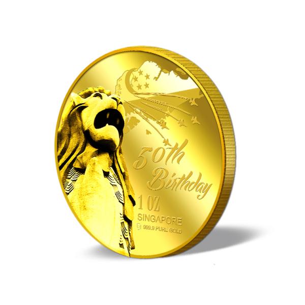 The Singapore's 50th Birthday gold Medallion design portrays Singapore’s national mascot, the Merlion, Singapore’s map, the crescent moon and five stars which are iconic of Singapore’s flag, and five fighter planes flying over the Singapore map.