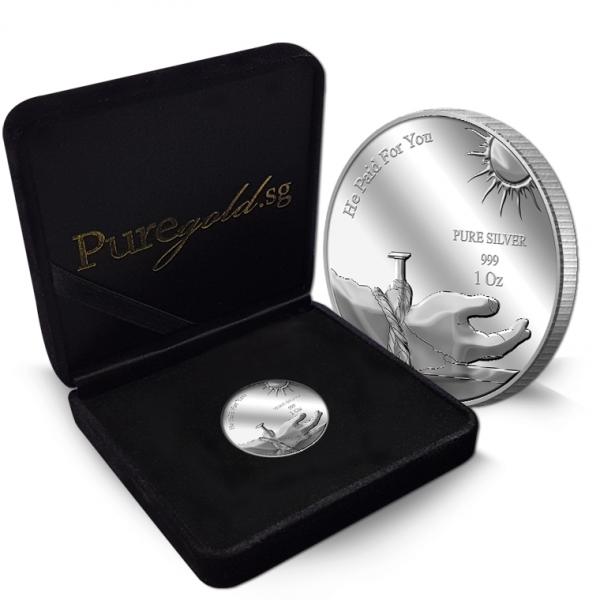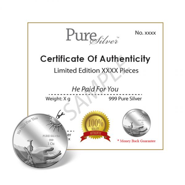 The images of "He Paid For You" are embossed on a 1Oz 999 fine silver medallion.