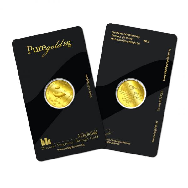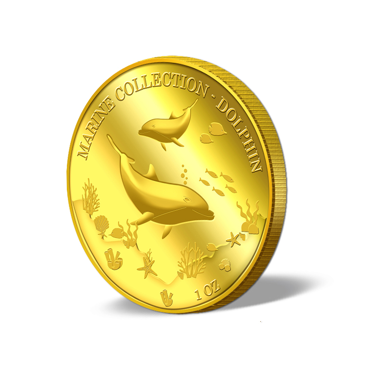 The image of the two dolphins is embossed on a 1oz 999.9 fine gold Medallion.