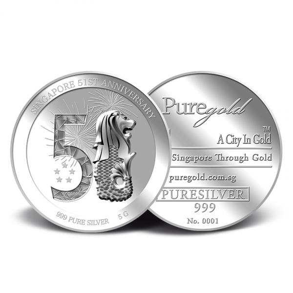 The 5g 51st Anniversary gold bar design portrays an image of the 51st year. The design also includes the inscription SINGAPORE 51ST ANNIVERSARY, the medallion’s weight and fineness, and GoldSilver Refinery’s “GS” logo mark.