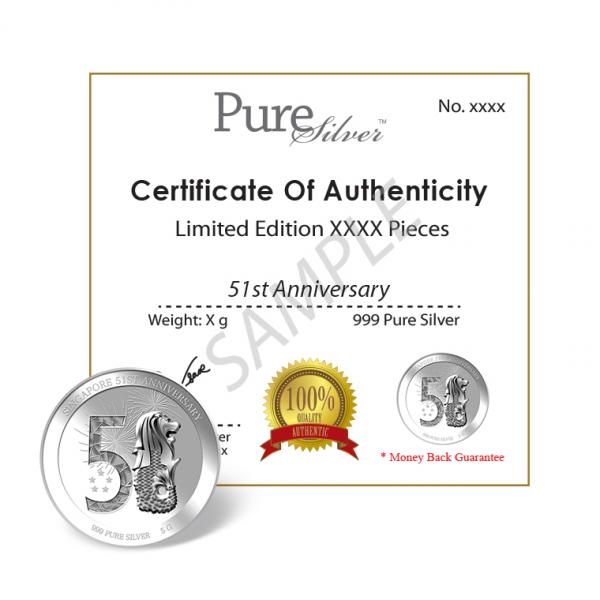 The image of Merlion and the five stars in the national flag is embossed on a 5g 999 fine silver medallion.