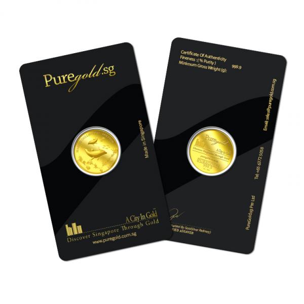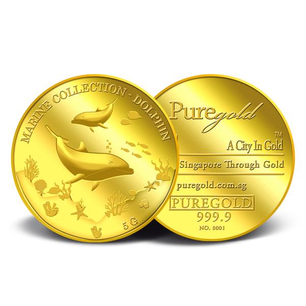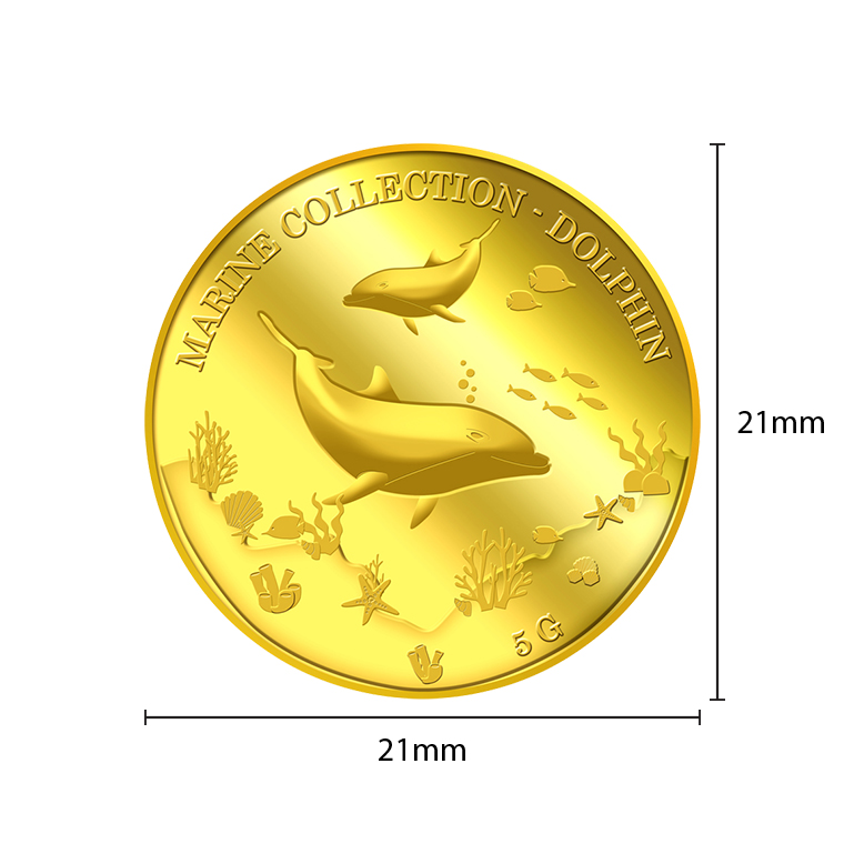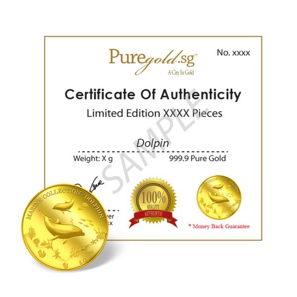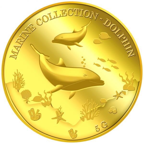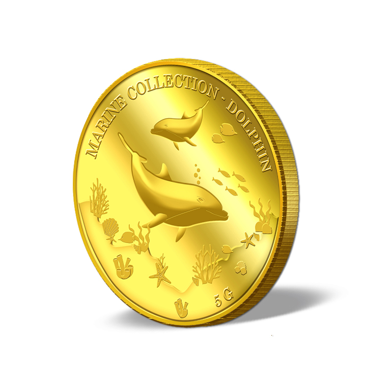 The image of the two dolphins is embossed on a 5g 999.9 fine gold Medallion.