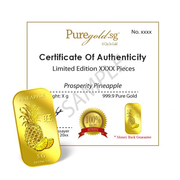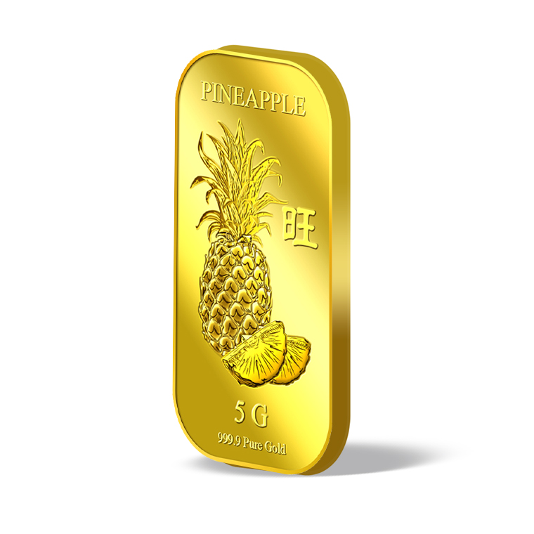 The image of the pineapple is embossed on a 5g 999.9 fine gold bar.