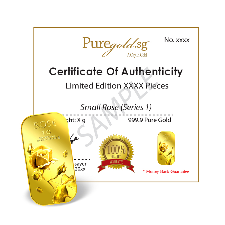 The image of the Rose is embossed on a 1g 999.9 fine gold bar.
