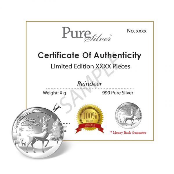 The image of Reindeer and the Snow is embossed on a 5g 999 fine silver Medallion.
