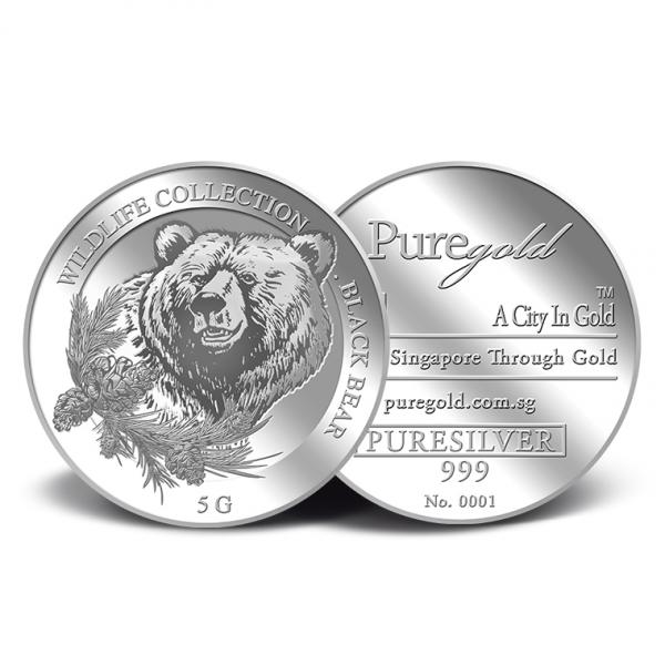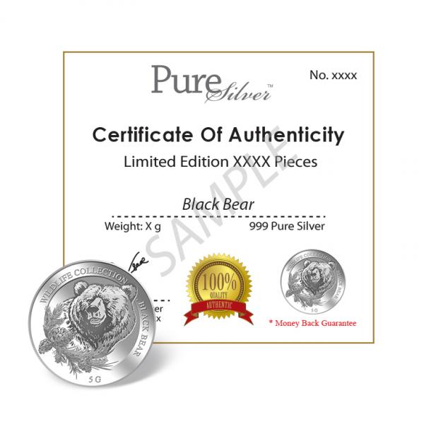 The image of an emerging black bear is embossed on a 5g 999 fine silver.