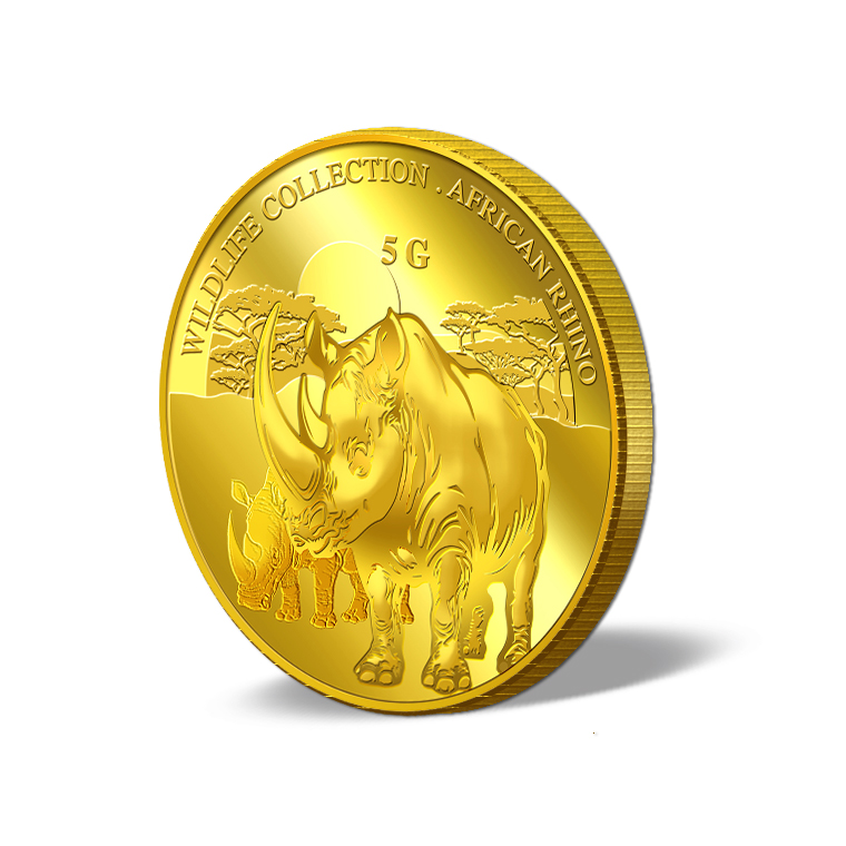 The image of a Rhinoceros is embossed on a 5g 999.9 fine gold.