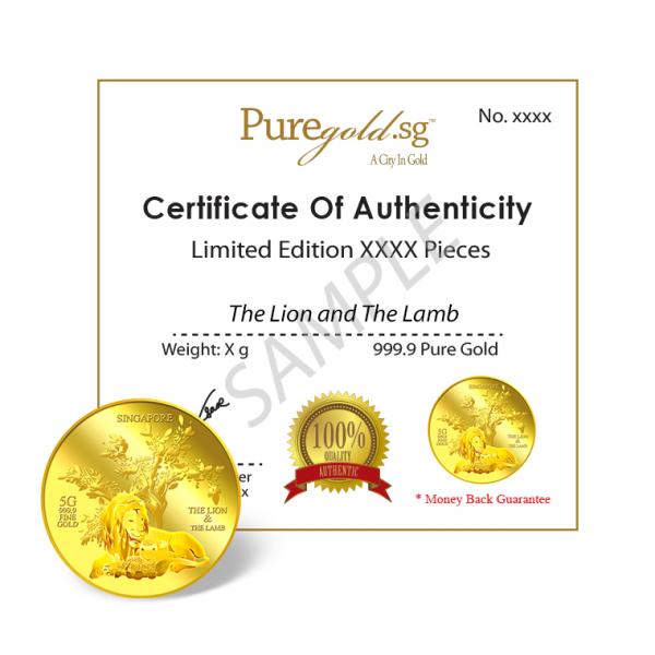 The images of The Lion & The Lamb are embossed on a 5g 999.9 fine gold medallion.