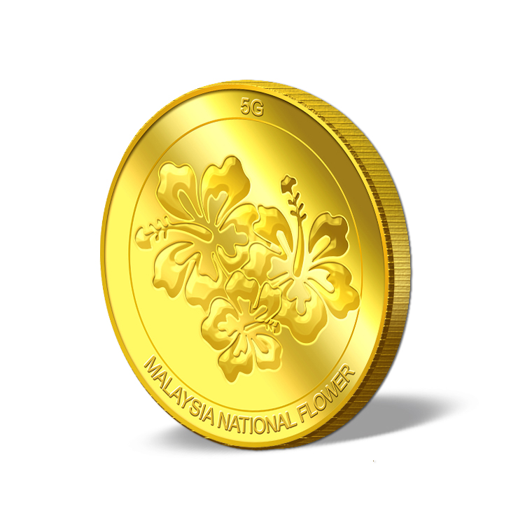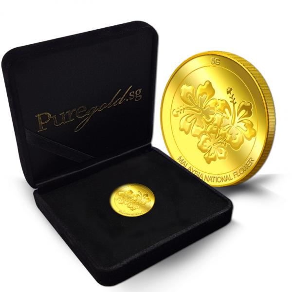 The image of the Hibiscus is embossed on a 5g 999.9 fine gold Medallion.
