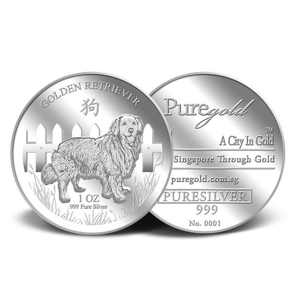 The image of the Golden Retriever is embossed on a 1Oz 999 fine silver.