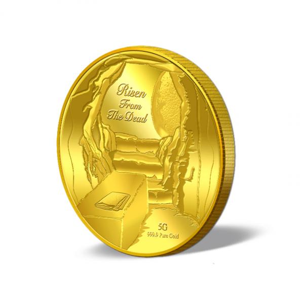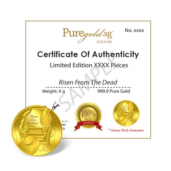 The images of Risen from the Dead are embossed on a 5g 999.9 fine gold Medallion.