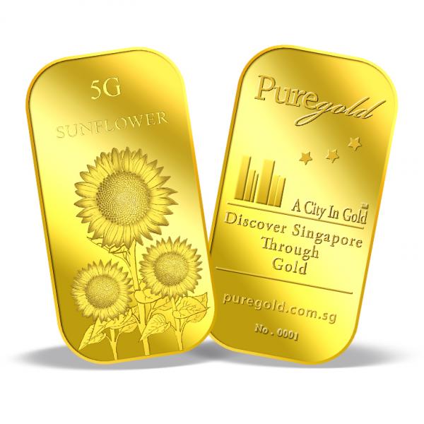 The image of the Sunflower is embossed on a 5g 999.9 fine gold bar.
