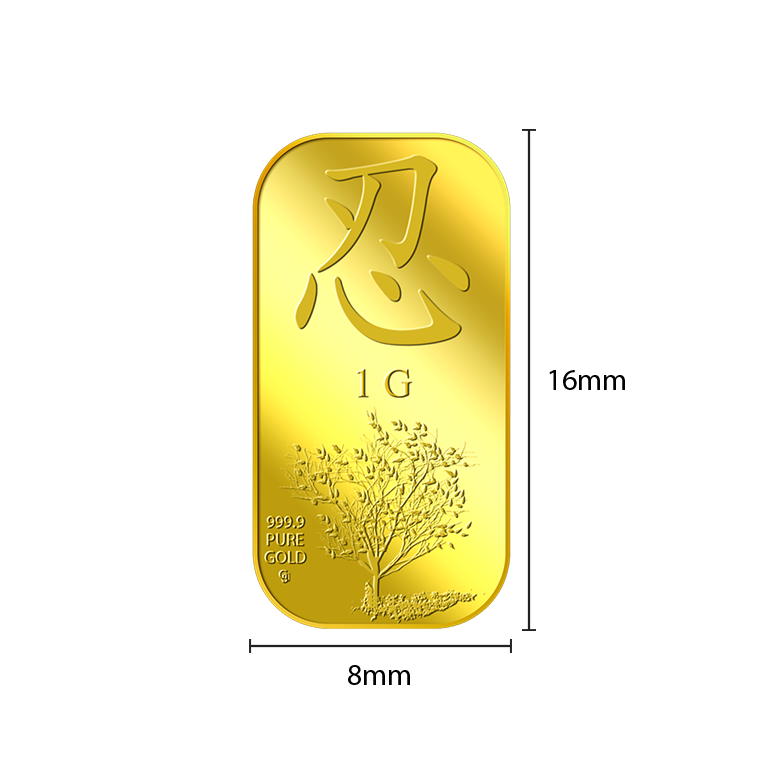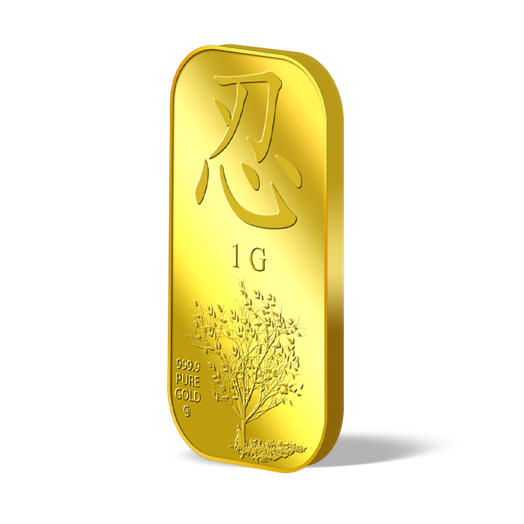 The image is embossed on a 1 gram 999.9 fine gold bar.