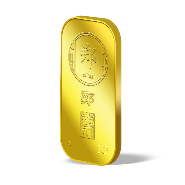 The image is embossed on a 1 gram 999.9 fine gold bar.