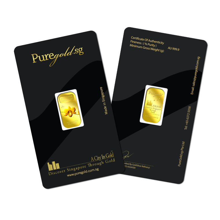 The image of Singapore’s national flower, Vanda Miss Joaquim Orchid, is embossed on a 5g 999.9 fine gold bar.