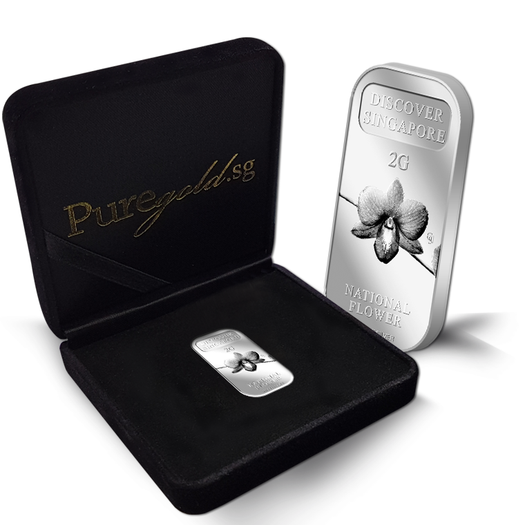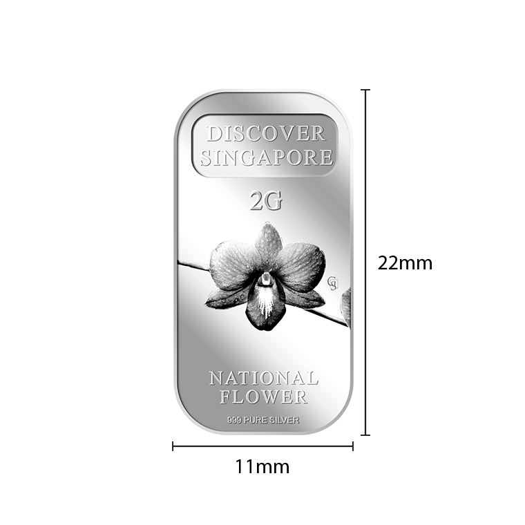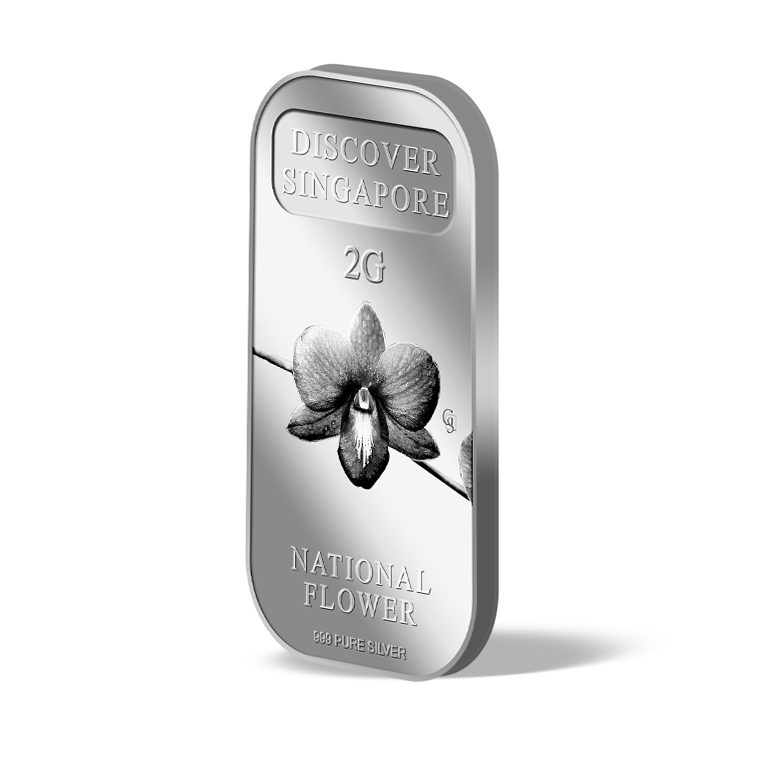 The image of Singapore’s national flower, Vanda Miss Joaquim Orchid, is embossed on a 5g 999.9 fine gold bar.