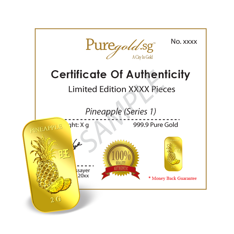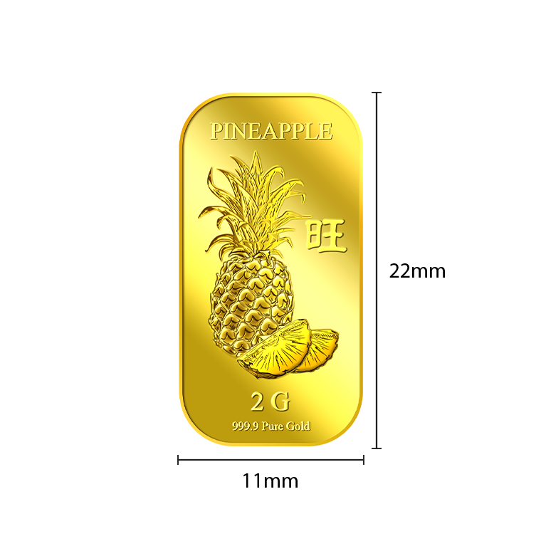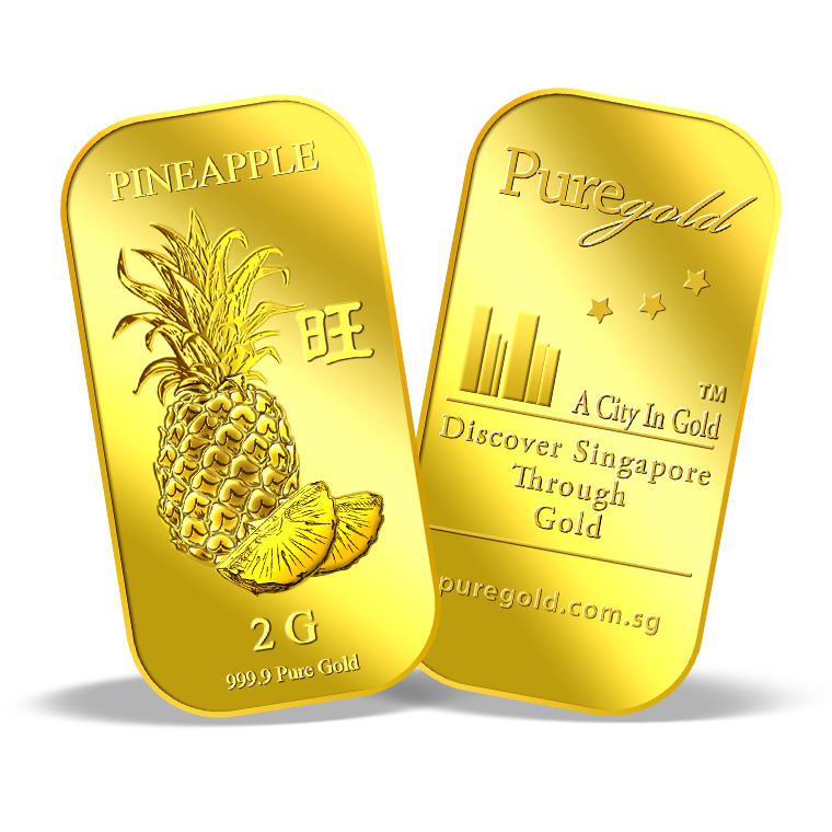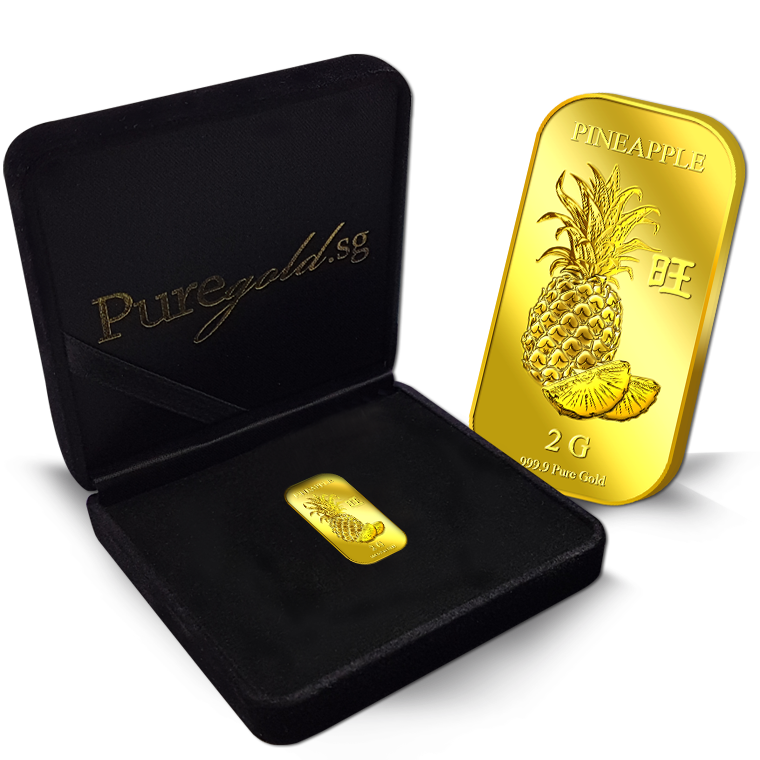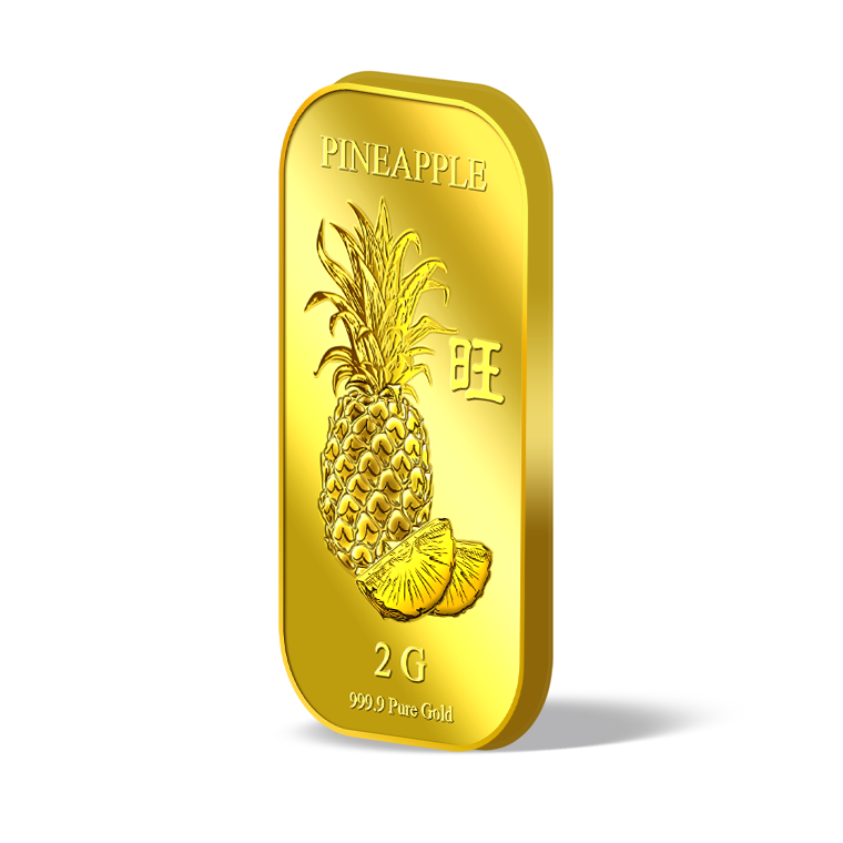 The image is embossed on a 2 grams 999.9 fine gold bar.