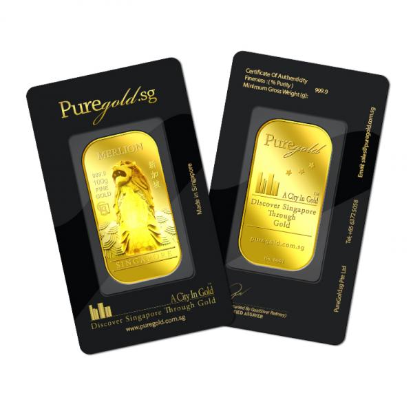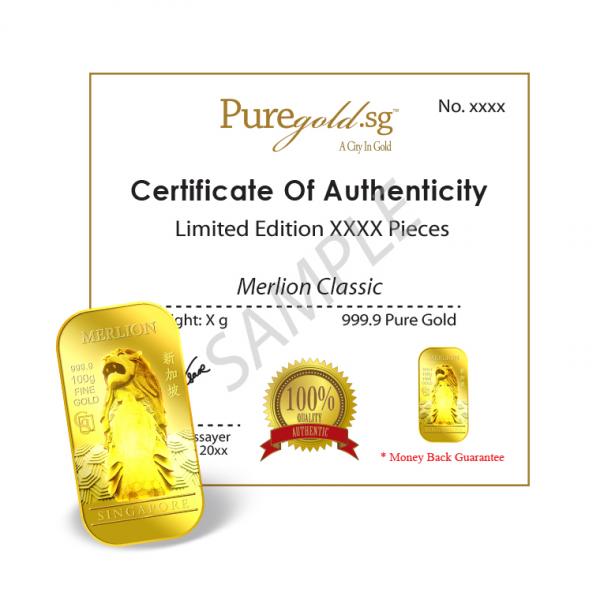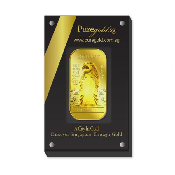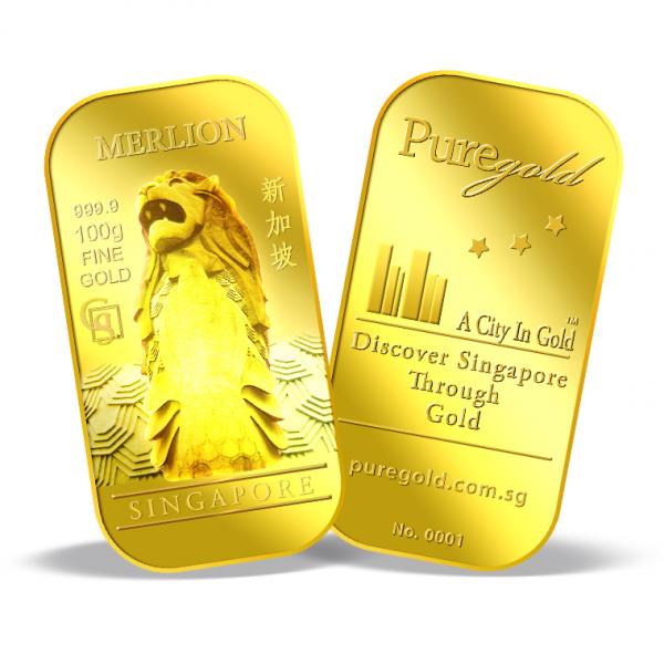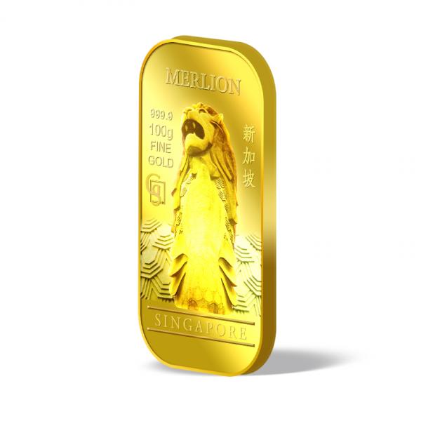 The images of Merlion are embossed on a 100g 999.9 fine gold bar.