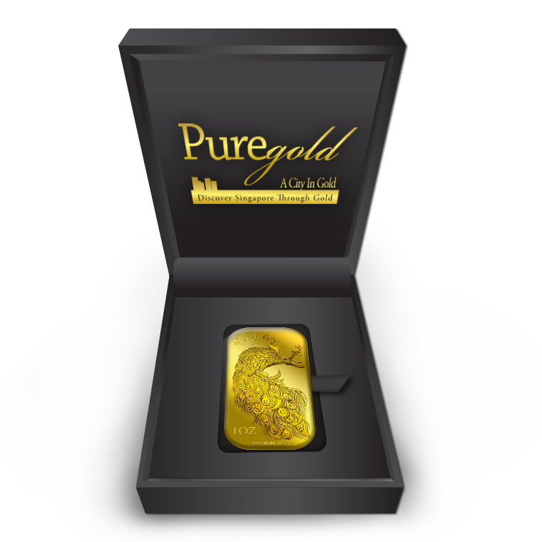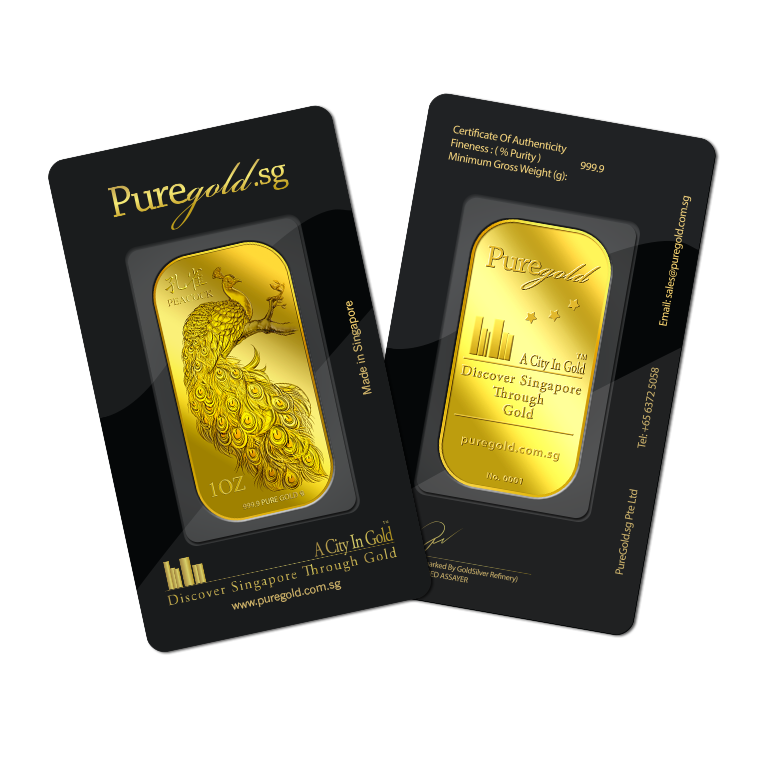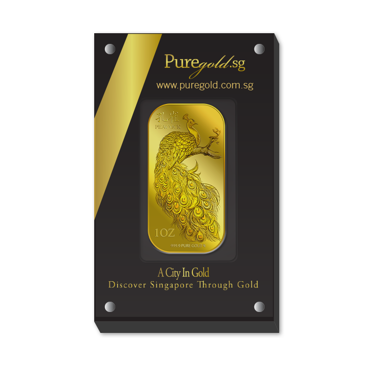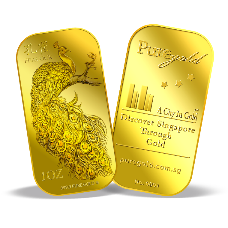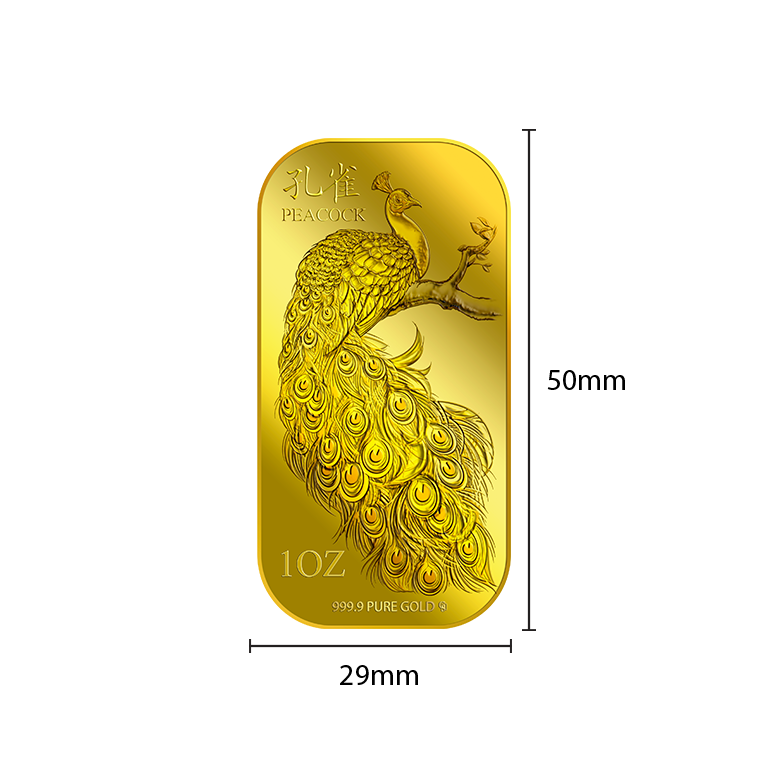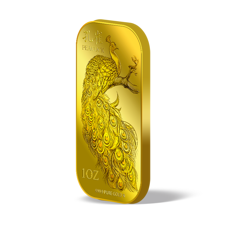 The image is embossed on a 1 troy oz 999.9 fine gold bar.