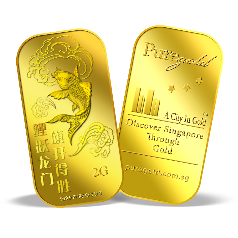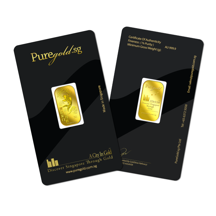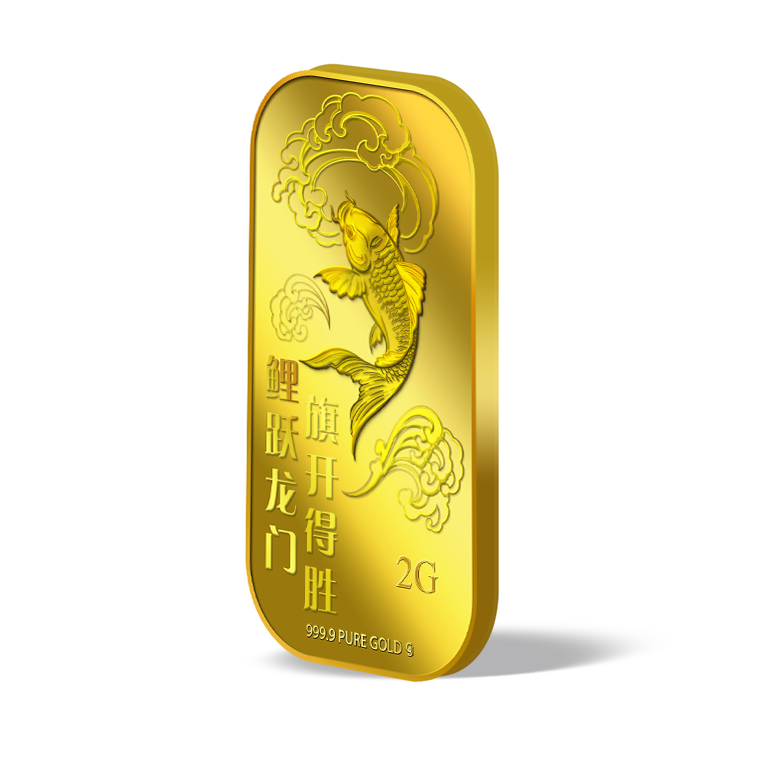 The image is embossed on a 2 grams 999.9 fine gold bar.