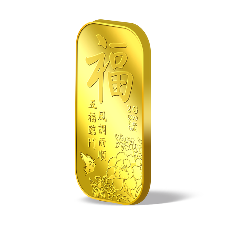 The image is embossed on a 2 grams 999.9 fine gold bar.