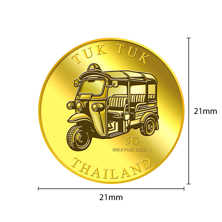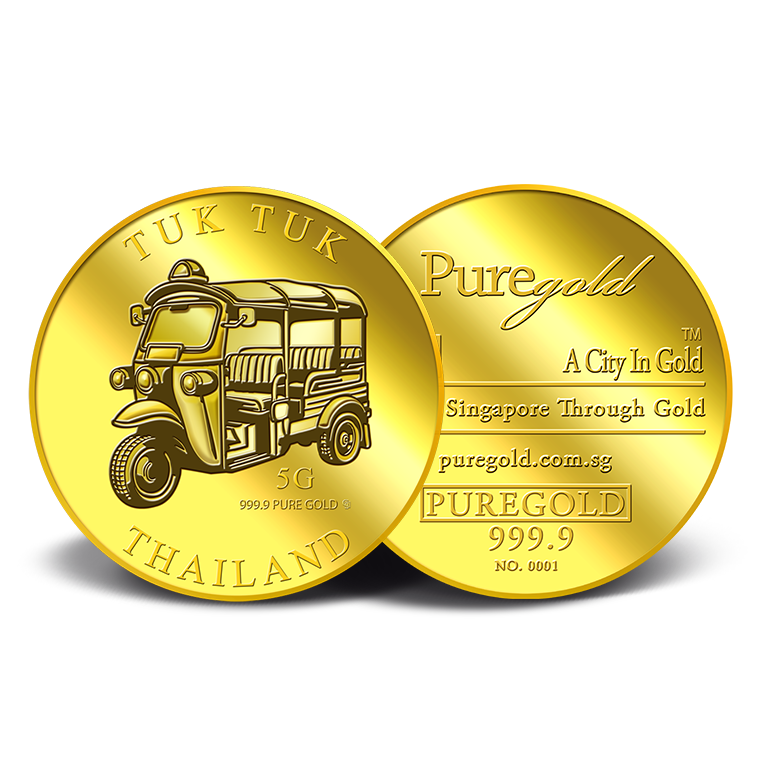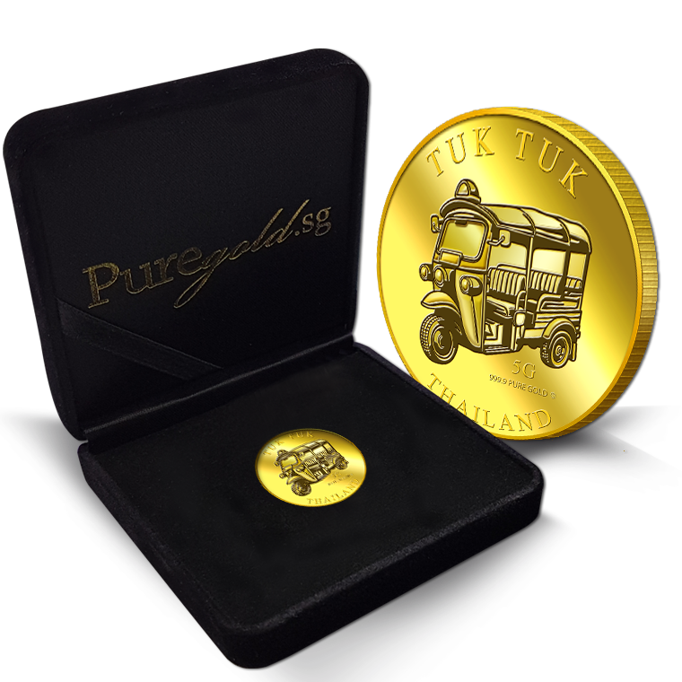 The image is embossed on a 5 grams 999.9 fine gold medallion.